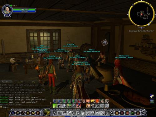 Gildenei - am 2.10 war es soweit. ich wurde offiziell in die sippe aufgenommen. leider konnte ich mein temperament nicht in zaum halten. als störenfriede im schluchtenflechter auftauchten und meine ehre auf die probe stellten, verwandelte ich das ruhige gasthaus in einen hinterhof. ich verprügelte die kerle und besoff mich anschließend sinnlos. meine rede fiel leider den nachwirkungen des hobbit-gesöffs zum opfer. ich fiel vom tisch und blieb bewußtlos inmiten der festgesellschaft liegen...nunja...die zwergische art zu feiern ist nicht jedermanns sache.